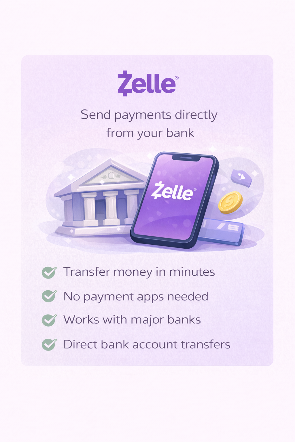 Zelle allows you to send payments directly from your bank account using your banking app.