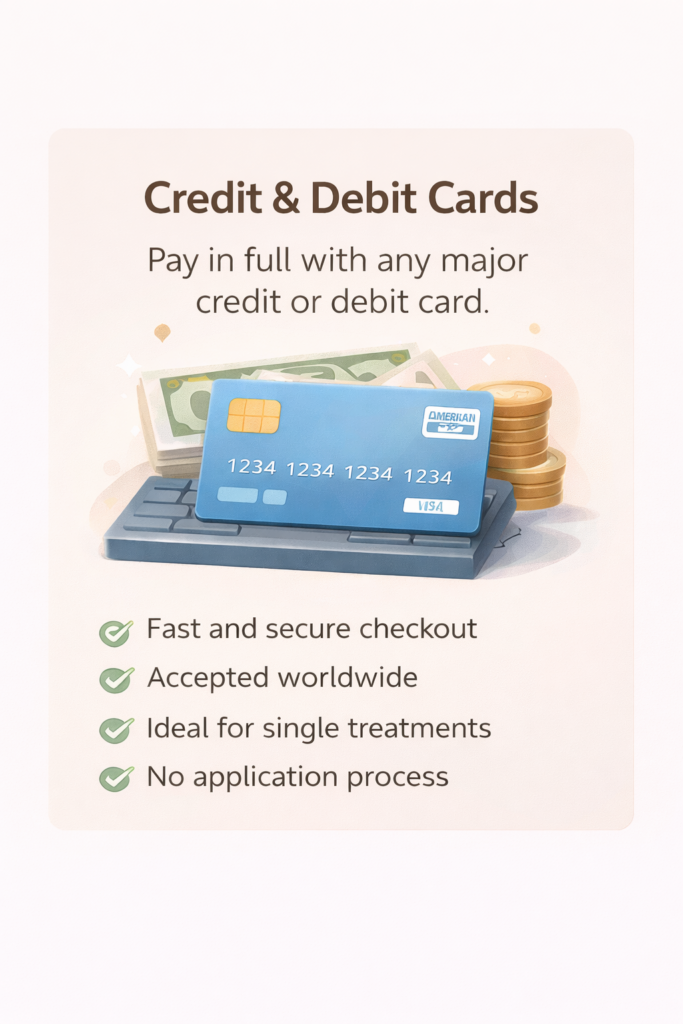 This option allows you to pay for your treatment in full at the time of service using the card of your choice.