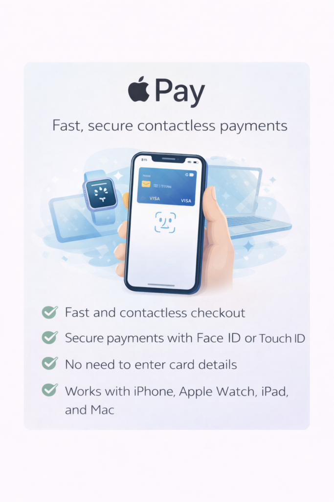 Apple Pay lets you make fast, secure payments using your iPhone, Apple Watch, iPad, or Mac. It allows you to complete your purchase without entering card details, making checkout quick and convenient.